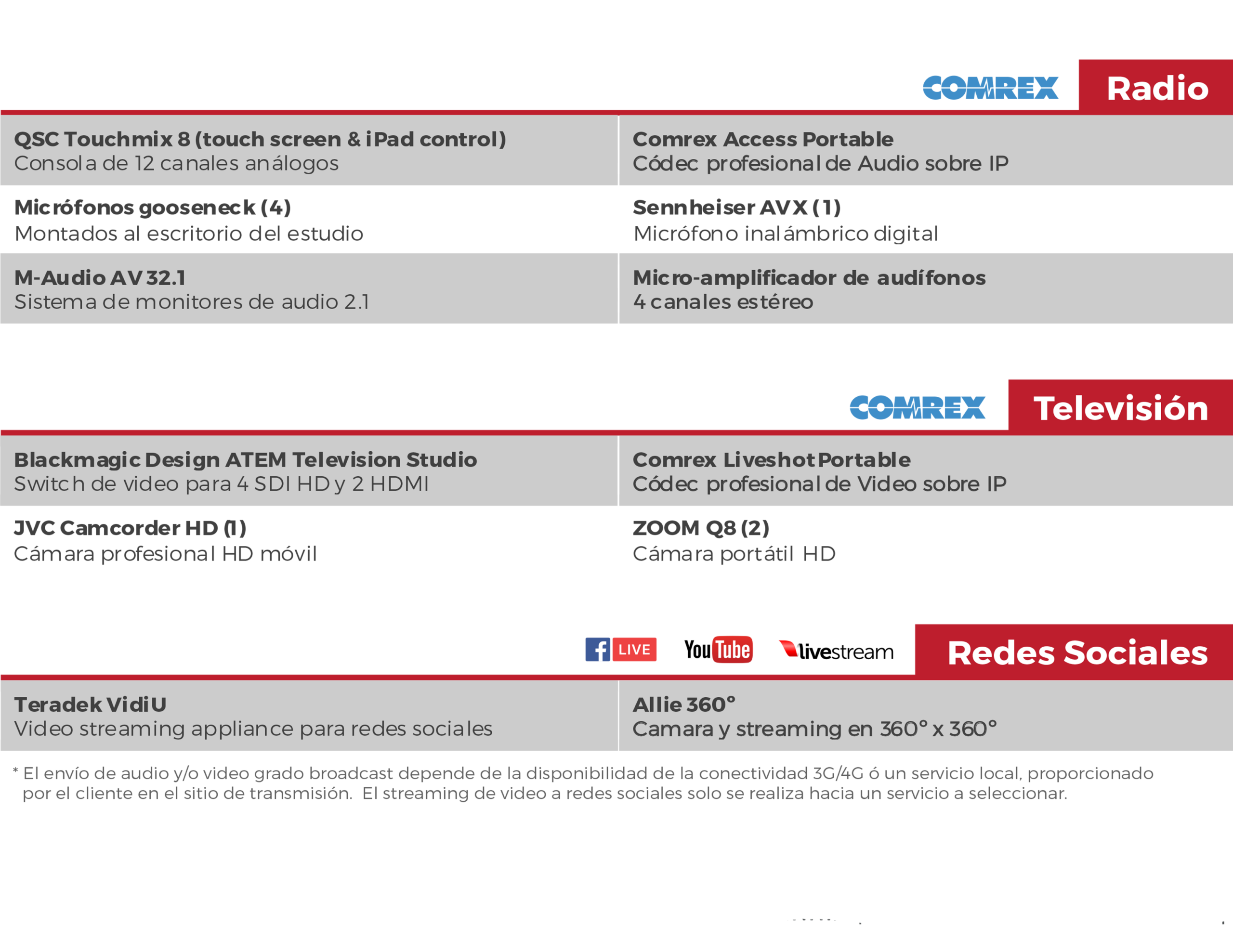 ◦Capacidad de transmisión en directo o grabación para Radio, Facebook live, YouTube Live, en video HD o 360.