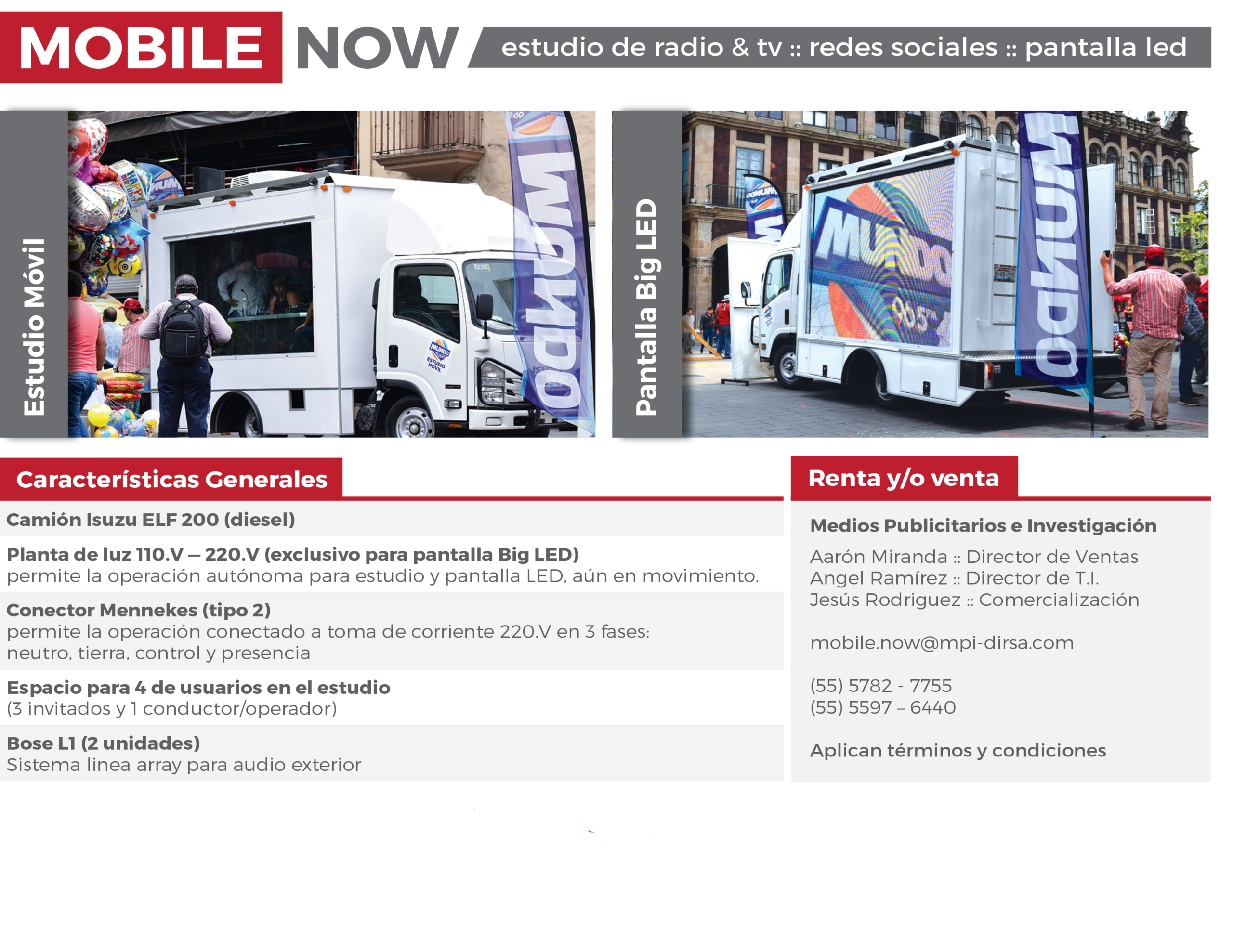 En MPI & DIRSA, presentamos un nuevo concepto en comunicación “Unidad Móvil Multimedia” “Mobile Now”, ofreciendo la mejor tecnología y un excelente espacio publicitario para su marca.